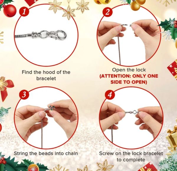 Norėdami suverti apyrankę, atsukite galinę dalį ir suverkite karoliukus ant grandinėlės. Tai atlikę, tvirtai užsukite galiuką. Nereikia jokių įrankių, klijų ar netvarkos. Karoliukus galima lengvai pakeisti nenaudojant jokių įrankių.