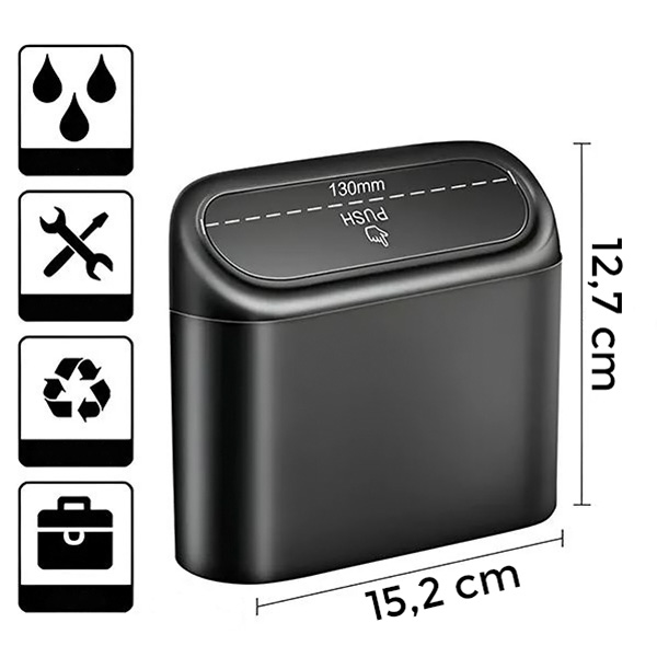Ši kompaktiška šiukšliadėžė palaiko švarą ir tvarką jūsų automobilyje, neužimdama per daug vietos. Jos konstrukcija užtikrina didelę talpą kasdienėms atliekoms, todėl ji yra praktiška ir nepastebima.