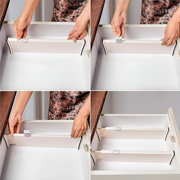 Netrukus baigsis dienos, kai tenka tvarkyti chaotiškus, netvarkingus stalčius. Su mūsų reguliuojamomis pertvaromis bet kokią netvarkingą erdvę paversti tobulai organizuota vieta bus paprasta. Dėl elegantiško dizaino ir greito montavimo jie taps pagrindine priemone, padėsiančia racionalizuoti sandėliavimą.